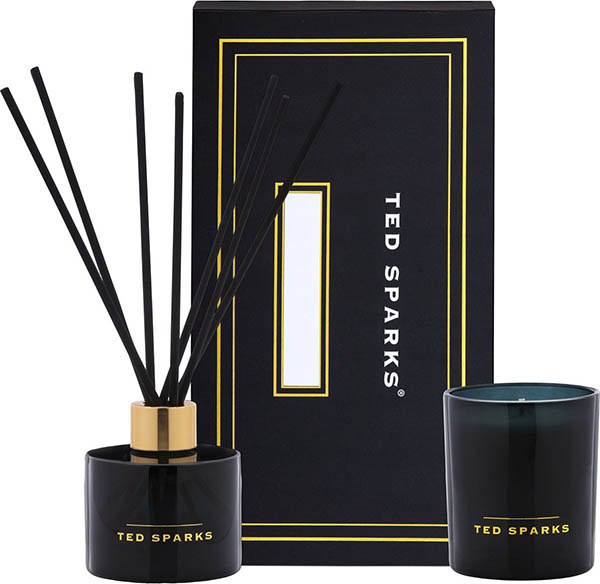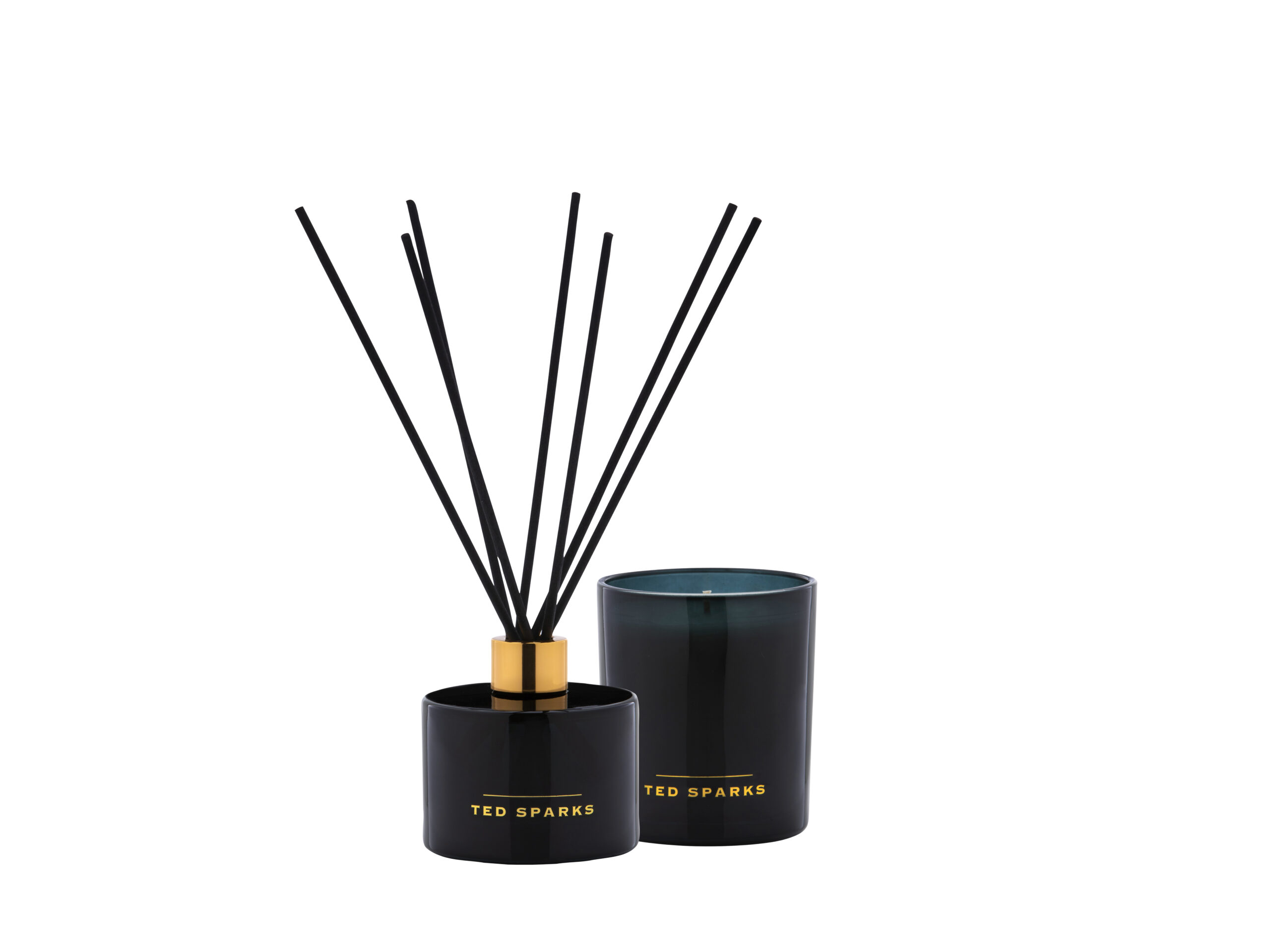 De Ted Sparks Giftset Bamboo & Peony bestaat uit een geurkaars en een diffuser, uitgevoerd in zwart glas met gouden details. De set zorgt voor een constante geur in huis en is geschikt voor dagelijks gebruik.