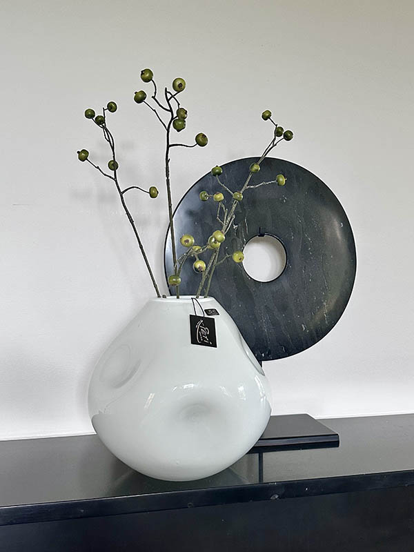 Het opaalwitte glas vangt het licht prachtig op, waardoor de vaas een zachte glans krijgt. Combineer haar met een losse bloem, droogtak of zijdebloem voor een subtiel maar elegant accent in huis.