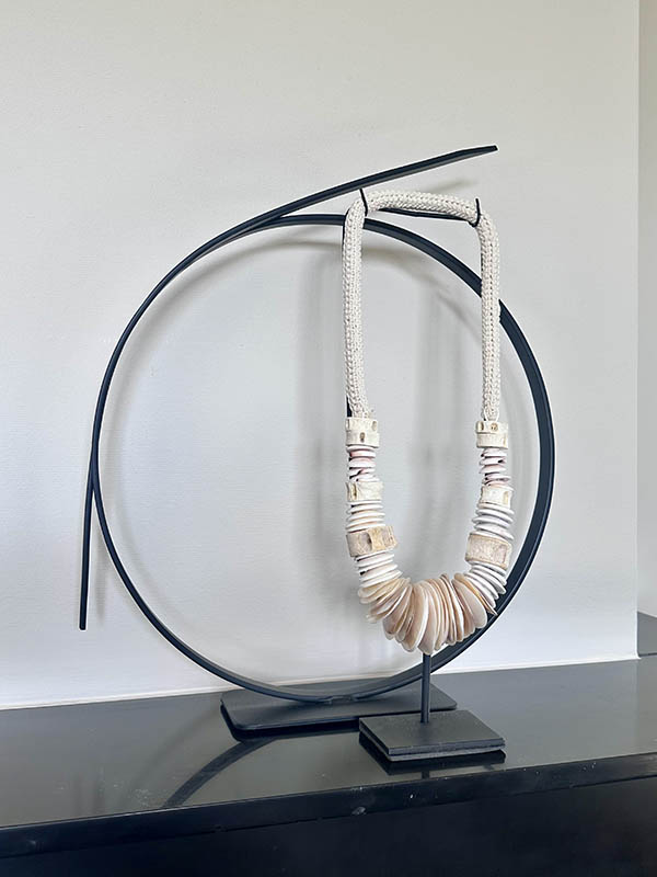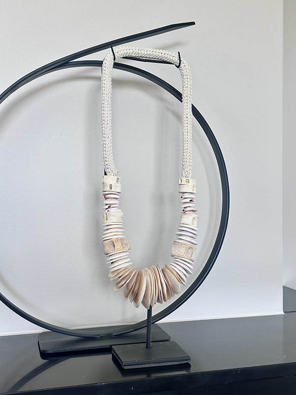 Of je dit ornament nu een plek geeft in een vakkenkast, op een dressoir of op een salontafel, de schelpenketting Mala trekt gegarandeerd de aandacht als stijlvolle eyecatcher. Dankzij de combinatie van natuurlijke materialen en een strak design past het zowel in een modern als in een meer bohemien interieur.