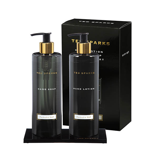 De Ted Sparks Hand Gift Set Patchouli & Musk is een complete set met een Hand Soap, Hand Lotion en bijpassende tray. De set is ontworpen voor dagelijks gebruik en zorgt voor verzorgde handen op vaste plekken in huis, zoals de keuken, badkamer of het toilet.
